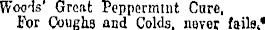 Woods' Great Peppermint Cure, For Coughs and Colds, never faiK*
