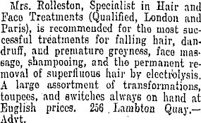 Mrs. Rolleston, Specialist in Hair and Faco Treatments (Qualified, London and Paris), is recommended for tho moat successful treatments for falling hair, dandruff, and premature greyness, face mas6ago, shampooing, and the permanent removal of superfluous hair by electrolysis. A largo assortment of transformations, toupees, and switches always on hand at Euglish prices. 256 Lambton Quay.— Advt.