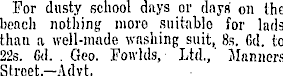 For dusty school days or days on the beach nothing more suitable for lads than a well-made washing suit, Bs. Gd. to 225. Gd. . Geo. Foivlds, Ltd.,' Manners Stroet.-Advt.