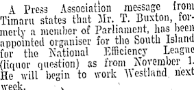 A Press Association message from Timaru states that Mr. T. Buxton, formerly a member of Parliament, has been appointed organiser for the South Island, for the National Efficiency League (liquor question) as from November 1. He will begin to work Westland, next week. s