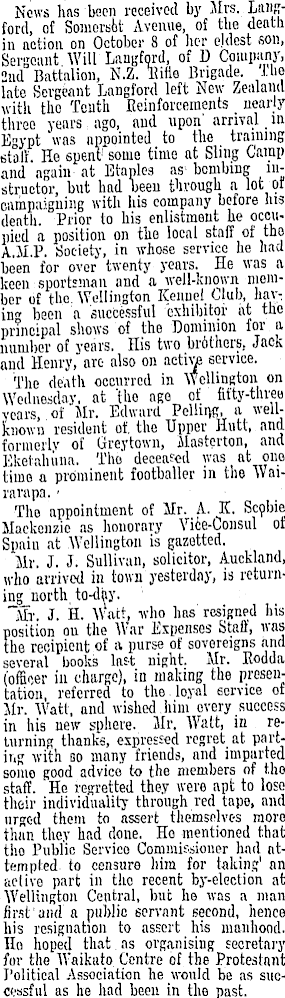 News has been received by Mrs. Laiiffford, of Somerset Avenue, of the death in action on October 8 of her eldest son, Sergeant Will Langfprd, of D Company, 2nd Battalion, N.Z. Bine Brigade. J.he late Sergeant Langford left New Zealand with the Tenth Eeinforcements nearly three years ago, and upon' arrival _in Egypt was appointed to the training staff. He spent' some time at Sling Camp and again at Etaples as' bombing instructor, but had been through a lot of campaigning with his company before his death. Prior to his enlistment he occupied a position on the local staff of the A.M.P. Society, in whose service he had been for over twenty years. He was a keen sportsman and a well-known member uf the Wellington Kennel Club, hay: in* been a successful exhibitor at the principal shows of the Dominion for a, number of years. His two brithcrs, Jack and Henry, are also on active service. The death occurred in Wellington on Wednesday, at 'the age of fifty-three years, of Mr. Edward Polling, a wellknown resident of. the Upper Hutt, and formerly of Greytown, Masterton, and Kkelahuna. Tho deceased was at one time a prominent footballer in the Wairarapa. ■ The appointment of Mr. A. K. Scobie Mackenzie as honorary Vice-Consul ot Spaiu at Wellington is gazetted. Mr. J. J. Sullivan, solicitor, Auckland, who arrived in town yesterday, is returningjiorth to-day. "Mr. J. H. Watt, who has resigned his position on the War Expenses Staff, was the recipient of a purse of sovereigns and several books last night. Mr. Rodda' (officer in charge), iu making the presentation, referred to the loyal service of Mr. Watt, and wished.him every success in his new sphere. Mr. Walt, in returning thanks, expressed regret at parting with so many friends, and imparted ! some good advice to the members of tho staff. He regretted they were apt to lose their individuality through red tape, and ! urged them to assert themselves more than they had done. Ho mentioned that tho Public Serrico Commissioner had attempted to censure him for taking' an active part in tho recent by-election at Wellington Central, but he was a man first'and a public servant second, hence his resignation to assert his manhood. Ho hoped that. as organising secretary for the Waikato. Centre of the Protestant Political Association he would be as successful as he had been in the past.