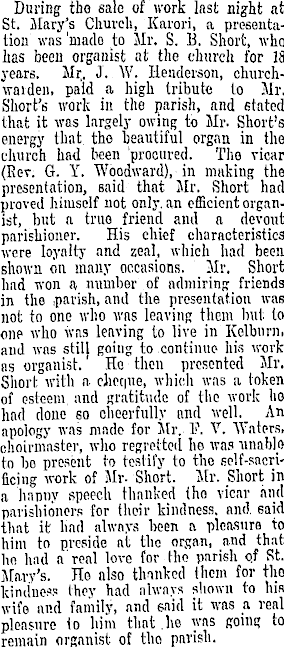 During tho sale of work last night at St. Mary's Church, Karori, a presentation was 'mado to Mr. S. B. Short, who has been organist at the church for 18 years. Mr,, J. W. Henderson, churchwaiden, paid a high tribute to Mr. Short's work in the parish, and stated that it was largely owing to Mr. Short's energy that, tho beautiful organ in the church had been procured. Tho vicar (Rev. G. Y. Woodward), in making tho presentation, said that Mr. Short had proved himself not only, an efficient organist, but a truo friend and a devout parishioner. His chief characteristics were loyalty and zeal, which had been shown on. many occasions. Mr. Short had won a number of admiring friends in the parish, and the presentation was not to one who was leaving them but to one who was leaving to live in Kelbnrn, and was stil) going to continue his work as organist. Ho then presented Mr. Short with a cheque, which was a token of esteem, and gratitude of the work ho had done so cheerfully and well. An apology was made for Mr. F. V. Waters, choirmaster, who regretted ho was iinablo to bo present to testily to tho self-sacri-ficing work of Mr- Short. Mr. Short in a hanny speech thanked (ho vicar and parishioners for their kindness, and. 6aid that it had always been a pleasure to him to preside at the organ, and that ho had a real love for the parish o.f St. Mary's. Ho also thanked thorn for tho kindness they had always shown to his wifo and family, and said it was a real pleasure (o him that .he was going to remain organist of tho parish.