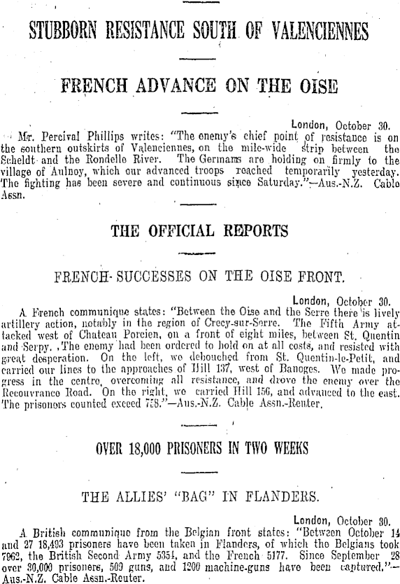 STUBBORN RESISTANCE SOUTH OF VALENCIENNES . " FRENCH ADVANCE ON THE OISE London, October 30. ' Mr. Percival Phillips writes: "The onemy'e chief point of resistance is on the southern outskirts of Valenciennes, on the mile-wide strip between tho Scheldt-and the Rondelle River. The Germans are holding on firmly to the village of Aulnoy, which our advanced troops roached temporarily yesterday. Tho fighting has been severe and continuous si?ice Saturday."—Aus.-N.Z. Cable Assn. THE OFFICIAL REPORTS FRENCH- SUCCESSES ON THE OISE FRONT. London, October 30. A. French communique states: "Between the Oise and tho Serro there 4s lively artillery action, notably in (he region of Crecy-aur-Sorrc. The Fifth Army attacked west of Chateau Porcien, on a front of eight miles, between St. Qnentin and Scrpy. .The enemy'hud been ordered to hold on at all costs, and resisted with great desperation. On tho left, wo debouched front St. Quentin-le-Pelit, and carried our lines to the approaches of TJ ill 137, west of Banogcs. Wo made progress in the centre, overcoming nil resistance, and drove tho enemy over tho Recouvranco Road. On tho right, wo carried Hill 150, and advanced to the east. The prisoners counted exceed 7£B. J ' —Aus.-N.Z. Cabje Assn.-Rcuter. \ OVER 18,000 PRISONERS IN TWO WEEKS THE ALLIES' "BAG" IN FLANDERS. London, October 30. A British communique from the Belgian front states: "Betwaon October W and 27 18,493 prisoners havo been taken in Flanders, of which tho Belgians took 7962, the British Second Army 5351, and tho French 5177. Since September 28 over 30,000 prisoners, 500 guns, and 1200 machine-guns hare been captured."— ' Aus.-N.Z. Cable Aesn.-Router.