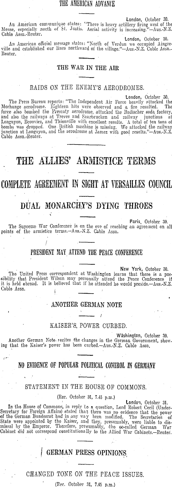 THE AMERICAN ADVANCE London, October 30. An American communKiiio states: "There is heavy artillery firing west of the Meuse, especially .north of St. .Tustis. Aerial activity is increasing."—Aus.-N.Z. Cable Assu.-Rcuter. London, October 30. An American official message states: "North of Verdun we occupied Aingreville and established our lines northward of the village."—Aus.-N.Z. Cable Assn.. Reuter. THE WAR IN THE AIR RAIDS ON THE ENEMY'S AERODROMES. London, October 30. The Press Bureau reports: "The Independent Air Force heavily attacked the Morhange aerodrome. Eighteen hits were observed and a, fire resulted. The force also bombed the Fi'escnty aerodrome, attacked the Badischer soda factory, and also the railways at Treves and Saaiibrucken and railway junctions at Longuyon, Ecouviez, and Thionville with excellent results. A total of ten tons of bombs was dropped. One British machine is missing. We attacked the railway junction at Longuyon, and the aerodrome at Jamez with good results."—Aus.-N.Z. Cable Assn.-Reuter. THE ALLIES' ARMISTICE TERMS COMPLETE AGREEMENT IN SIGHT AT VERSAILLES COUNCIL DUAL MONARCHY'S DYING THROES Paris, October 30. The Supremo War Conference is on the eve of reaching an agreement on all points of the armistice terms—Aus.-N.Z. Cable Assn. / • PRESIDENT MAY, ATTEND THE PEACE CONFERENCE New York, October 30. The United Press correspondent at Washington iearns that there is a possibility that President Wilson may personally attend the Peace Conference if it is held abroad. It is believed that if he attended he would preside—Aus.-N.Z. Cable Assn. : , • ■ ANOTHER GERMAN NOTE / KAISER'S. POWER CURBED. Washington, October 30. Another German Note, recites the changes in the German Government, showing that the Kaiser's power has been curbed.—Aus.-N.Z. Cable Assn. NO EVIDENCE OF POPULAR POLITICAL CONTROL IN GERMANY STATEMENT IN THE HOUSE OP COMMONS. (Bee. October 31, 7.45 p.m.) London, October 31. In this House of Commons, in reply to a question, Lord Robert Cecil (UnderSecretary for Foreign Affairs) stated that there was no evidence that the power of the German Bundesrat had in any way been modified. The Secretaries of State wero appointed-by the Kaiser, and they, presumably, wero liable to dismissal by the Emperor. Therefore, presumably, itho so-called German War Cabinet did not correspond constitutionally to the Allied War Cabinets.—Renter. | GERMAN PRESS OPINIONS CHANGED TONE ON THE PEACE ISSUES. ' (Rec. October 31, 7.45 p.m.)