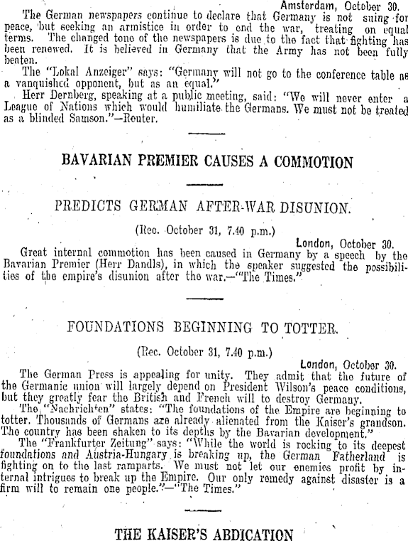 ,_. '„ ..',,', Amsterdam, October 30. The German newspapers continue to declare that Germany is not suing for peace, 'but seeking an armistice in order to ond the war, treating on equal terms. The changed tono of tho newspapers is duo to the fact that- fighting has been renewed. It is believed in Germany that the Army has not been fully beaten. ■ The "Mai Anzeiger" says: "Germany will not go to the conference table ae a vanquished opponent, but as an equal, Herr Dernberg, speaking at a public meeting, said: "We will never enter a League of Nations which would humiliate, the Germans. We must not bo treated as a blinded Samson. —Router. BAVARIAN PREMIER CAUSES A COMMOTION PREDICTS GERMAN DISUNION. (Iteo. October 31, 7.40 p.m.) _~-,. .-■.,, , . „ London, October 30. breat internal commotion has been caused in Germany by a speech by the Bavarian Premier (Herr Dandls), in which the speaker suggested the possibilities of the empire's disunion after the war—"The Times." FOUNDATIONS BEGINNING TO TOTTER. (E«c. October 31, 7.40 p.m.) m „ „ London, October 30. The German Press is appealing for unity. They admit that tho future of the Germanic union will largely depend on President Wilson's peace conditions, but they greatly fear tho British and French will to destroy Germany. The. : "Nachrich%i" states: "The foundations of the. Empire are beginning to totter. Thousands of Germans are already alienated from the Kaiser's grandson. Tho country has been 6haken to its depths by the Bavarian development." The "Frankfurter Zcitung" says: "While the world is rocking to its deepest foundations and Austria-Hungary.is breaking np, the German Fatherland is fighting on to tho last ramparts. We must not let our enemies profit by internal intrigues to break up the Empire. Our only remedy against disaster is a firm will to remain one people.'-'—"The Times." THE KAISER'S ABDICATION