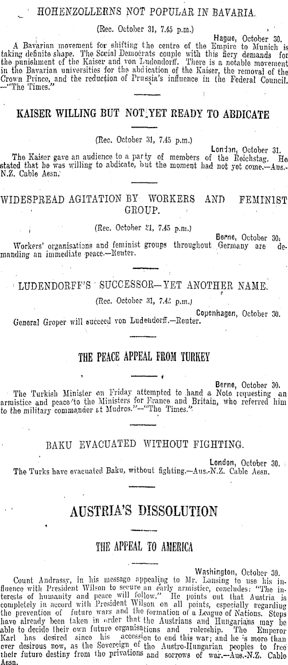 _ ' HOHENZOLLERNS NOT POPULAR IN BAYARIA. (Bee. October 31, 7.45 p.m.) i ' ~... it Hague, October 30. A Bavarian movement for slutting the centre of the Empire to Munich is taking definite shape. The Social Democrats couple witli this fiery demands for the punishment cf the Kaiser and von Ludondortf. There is a notable movement in ■the Bavarian universities for the abdication of the Kaiser, the removal of the Crown Prince, and the reduction of Prussia's influence in the Federal Council. —"Tho Times." v KAISER WILLING BUT NOT;YET READY TO ABDICATE (Eec. October 81, 7.45 p.m.) , „ ... , ' , Union, October 31. The Kaiser gave an audience to a party of members of the Reichstag. He stated that he was willing to abdicate, but the moment had not yet come.—Aus.N.Z. Cable Aesn; WIDESPREAD AGITATION BY WORKERS AND FEMINIST GROUP. • i (Rec. October SI, 7.45 p.m.) Bowie, October 30. Workers'organisations and feminist groups throughout .Germany are demanding an immediate peace.—Keuter. ' LUDENDORFF'S ' SUCCESSOR-YET ANOTHER NAME.' (Rec. October 31, 7.4,-; p.m.J Copenhagen, October 30. General Groper will succeed von Ludendorff.-Eeuter. THE PEACE APPEAL FROM TURKEY ■> 1 ■ ■ Berne, October 30. The Turkish Minister on Friday attempted to hand a Noto requesting an armistice and peace'to tho Ministers for France and Britain, who referred him to tho military commander st Mudros."—"The Times.". BAKU EVACUATED WITHOUT FIGHTING. London, October 30. ; The Turks have evacuated Baku, without fighting.—Aus.-N.Z. Cable Aesn. AUSTRIA'S DISSOLUTION THE APPEAL TO AMERICA Washington, October 30. Count Andrassy, in his messago appealing to Mr. Lansing to use his influence with President Wilson to secure an early armistice, concludes: "The interests of humanity and peace will follow." Ho points out that Austria is completely in accord with President Wilson on all points, especially regarding tho prevention of future wars and tiio formation of a Leaguo of Nations. Stops have already been taken in order dint the Austrians and Hungarians may be ablo to decide their own future organisations and rulership. Tho Emperor Karl has desired sinco his accession to end this war; and he : s more than over desirous now, as tho Sovereign of tho Austro-llungarian peoples to freo their future destiny from (ho privations M( j sorr pws of waJ.-Aus.-N.Z. Cablo Aesn.