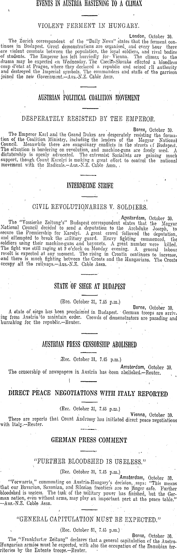 EVENTS IN AUSTRIA HASTENING TO A CLIMAX VIOLENT FERMENT IN HUNGARY. . , London, October 30. The Zurich correspondent of the "Daily News" slates that the ferment continues in Budapest. Great demonstrations are organised, and every hour there' are violent combats between the population, the loyal soldiers, and rival bodies, of students. The Emperor has left hurriedly for' Vienna. The climax to the drama may be expected <;n Wednesday. The Cz/Cclfo-Slovalcs effected a bloodless coup d'etat at Prague, where they declared a republic n.nd seized rll authority and destroyed the Imperial symbols. The commanders and staffs of tho garrison •joined the now GovernuHnt.—Aus.-N.Z. Cable Assn. AUSTRIAN POLITICAL COALITION MOVEMENT DESPERATELY RESISTED BY THE EMPEROR, ml _ Berne October 30. The Emperor Karl and Ihe Grand Dukes are desperately resisting tho formation of the Coalition Ministry, including the leaders of the Magyar National Council. Meanwhile there are sanguinary conflicts in the streets if Budapest. The situation is bordering on revolution, and machine-guns are freely used. A dictatorship is openly advocated. The extremist Socialists are gaining much support, (hough Count Karolyi is making a great effort to control tho national movement with the Radicals—Aus.-N.Z. Cable Assn. , INTERNECINE STRIFE CIVIL REVOLUTIONARIES V. SOLDIERS. „,,'„'., . .Amsterdam, October 30. ihe vossische Zeitung's" Budapest correspondent states that the Magyar National Council decided to send a deputation to tho Archduke Joseph, to secure the Premiership for Karolyi. A great crowd followed the deputation, and'attempted to break tho militairy guard. Heavy fighting commenced, the soldiers using their machine-guns and bayonets. A great number were killed. The fight was still raging at 9 o'clock on Monday evening. A general labour rovolt is oxpeoted at any moment. The rising in Croatia continues 1o increase, and there is much fighting between the Croats and the Hungarians. The Croats occupy all the railways.—Aus.-N.Z. Cable Assn. ' . STATE OF SIEGE AT BUDAPEST (Reo. October 31, 7.45 p.m.) , L , „ . , , ~/ , Berne > October 30. A state of. siege has been proclaimed in Budapest. ' German troops aie arriving from Austria Ho maintain order. Crowds of demonstrators are parading and hurrahing foe the republic—Renter. i ' AUSTRIAN PRESS CENSORSHIP ABOLISHED ■ ,1160. October 31, 7.45 p.m.) Amsterdam, October 30. The censorship of newspapers in Austria has been abolished.—Reuter. I ■ DIRECT PEACE NEGOTIATIONS WITH ITALY REPORTED (Rec. October 31, 7.45 p.m.) , „ , _ , • , Vienna, October 30. There are reporls that Count Andrassy has initiated direct peace negotiations with Italy.—Reuter. GERMAN PRESS COMMENT "FURTHER BLOODSHED IS USELESS." (Rec. October 31, 7.45 p.m.) „ Amsterdam, October 30. vorwaerts, common ting on Austria-Hungary's decision,, says: "This means that our Bavarian, Saxonian, and Silcsian frontiers are no J6nger safe. Further bloodshed is useless. The ta.sk of tho military power has finished, but the German nation, even without arms, may play an important part at the peace table." —Aus.-N.Z. Cable Assn. "GENERAL CAPITULATION MUST BE EXPECTED." (Rec. October 31, 7.15 p.m.) mi «r- ic i. <, - t „, , „ , Benie . October 30. I ho, 'Frankfurter Zeitung declares that a general capitulation of the AustroHum?anan armies must be expected, with also the occupation of the Dnmnbian territories by the Entente troops.—Reuter.