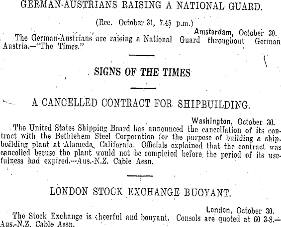 GERMAN-AUSTBIANS BAKING A NATIONAL GUARD. (Bee. October 31, 7145 p.m.) ' ■■■ mt, A --« r- •'■ ■••■ „r ~' ''. Amsterdam, October 30. The German-Austnans arc raising a National Guard throughout German. Austria— The Times. ■ ~ "■ '"■ \' .' . ( ■ . SIGNS OF THE TIMES -- A CANCELLED CONTRACT FOR SHIPBUILDING. mi tt -i j„i . ci • • r. , , ■ Washington, October 30. .llio United States Mnpping Board has announced the cancellation of its contract with the Bethlehem Steel Corporation for the purpose of building ft ship, building plant at Alameda, California. Officials explained that the contract was cancelled becuso tho plant would not 'be completed before the period of its usefulness had expired.—Aus.-N.Z. Cable Aesn. LONDON STOCK EXCHANGE BUOYANT. ■~,,., . , , , , , „ London, October 30. . a «,e Stock Exchange is theerful and bouyant. Consols aire quoted at GO 3-8-Aus.-N.Z. Cable Assn.