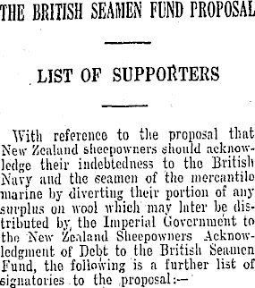 THE BRITISH SEAMEN FUND PROPOSAL . LIST OF SUPPORTERS With reference to the proposal that New Zealand slieepowners should acknowledge their indebtedness to the British Navy and the seamen of tho mercantile marine by diverting their portion of any surplus on wool which'-may later be distributed by, the Imperial Government to tho New Zealand Slieepowners Acknowledgment of Debt to the British SeamenFund, the following is a further list of signatories to the proposal:—'
