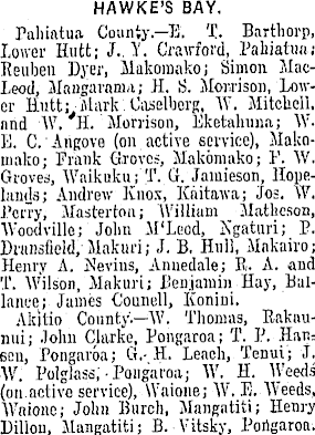 HAWKE'S BAY. Pahiatua County.—B. T. Barthorp, Lower Hutt; J.. Y. Crawford, Pahiatua; Reuben Dyer, Makomako; Simon MacLeod, Mangaranw; H. S. Morrison, Lower Hutt;.Mark.Caselborg, W. Mitchell, and W. H. Morrison, Eketahuna; W. E. C.'Arigove (on active service), Makomako; Frank Groves, Makomako; F. W. Groves, Waikuku; T. G. Jainieson, Hopelands; Andrew Knox, Kaitawa; Jos. W. Perry, Masterton; William Matheson, Woodville; John M'Leod, Ngaturi; P. Dransfield, Makuri; J. B. Hull, Mnkairo; Henry A. Nevius, Anuedale; B» A. and T. Wilson, Makuri; Benjamin Hay, Ballance; James Counell, Konini. Akitio County'.—W. Thomas, Raknunui; John Clarke, Pongaroa; T. P. Han= eeu, Pongaroa; G.-H. Leach, Tenui; J. W. Polglaso-;- Pongaroa; W. H. Weeds (on active service), Waione; W. E. Weeds, Wnione; John Burch, Mangatiti; Henry Dillon, Mangatiti; B. Vitsky, Pongaroa.