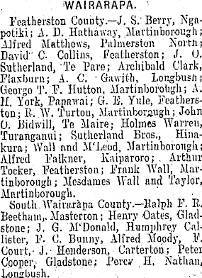 WAIRARAPA. ' Eeatherston County—J. S;Berry, Ngapotiki; A. D. Hathaway, .Martinhorough; Alfred Matthews, Palmerston Nortnj David" C- Collins, Eeatherston; J. U. Sutherland, Te Pare; Archibald Clark, Plaxburn; A. C, • Gawith, Longbusn; Georgo T. E. Hutton, Martinborohgh; A. H. I'ork, Papnwai; G. E. Yule, Featherston; R. W. Turtou, MartinborAUgh; John 0. Bidwill, Te Maire; Holmes Warren, Turahganui; Sutherland Bros., Hinakura; Wall and M'Leod, Martiuborough; Alfred Ealkner, Kaiparoro; . Arthur Tocker,.Eeatherston; Frank Wall, Martinborough; Mesdames Wall and Taylor, Mnrtinborongh. South.Waintrapa County.—Ralph F. R. Beetham,. Masterton; Henry Oates, Gladstone; 3. G. M'Donald, Humphrey Callister, F. C. Bunny, Alfred Moody, F. Court,- J.- Henderson, Carterton; Peter Cooper,- Gladstone; Percy H. Nathan, Lonsbush. '