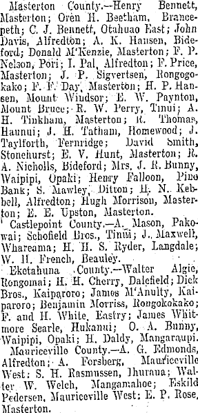 Masterton County.—Henry Bennett, Masterton; Oren H. Beetham, Brancepeth; C. J. Bennett, Otaliuao East; .lohn Davis, Alfredtbn; A. K. Hansen, Bideford; Donald M'Kenzie, Masterton; F. P. Nelson, Pori; I. Pal, Alfredtou; F.Price, Masterton; J. P. Sigvertsenj Bongogokako;l<\l'VDay, Masterton; H. P. Hansen, Mouoit- Windsor; E. W. Paynton, Mount Bruce;-B. W. Perry, Tinui; A. H. Tiukkam, Masterton; It. Thoma?, Haunui; E. Tatham, Romewood; J. Taylforth, Fernridge; David [smith, Stonehurst; E. V. Hunt, Masterton; 11. A. Nicholls, Bideford; Mrs. J. K. Bunny, Waipipi, Opaki; Heiwy Walloon, Pine Bank; S. Mawley,,Ditton; 11. N.. Kebbell, Alfredton; Hugh Morrison, Masterton; E. E. Upston, Masterton. 1 Castlepoint County.—A. Mason, Pakc- ; wai; Scbofield Bros., Tinifi; J „ Maxwell, Whareama; H. 11. S. Byder, Langdale; \V. 11. French, Beauley. : Eketalmna ...County-Walter Algie, Rongoinai; H-.'.'H. Cherry, Dalefield; Dick Bros., Kaiparoro; James M'Anulty, Kaiparoro; Benjamin Morriss, Hongokokako; F. and H. White. Eastry; James Wliitmore Searle, Hukanui; 0. A. Bunny, Waipipi, Opaki; H. Daldy, Mangar.aupi. Mauricevillo County.—A. G. Edmonds, Alfredton;- A. Forsberg, Mnurieevillo West; S. H. Easnmssen, Ihuraua; Walter W. Welch, Mangamahoe; Eskild Pedersen, Mauriceville W 7 est: E. P. Eose. Masterton.