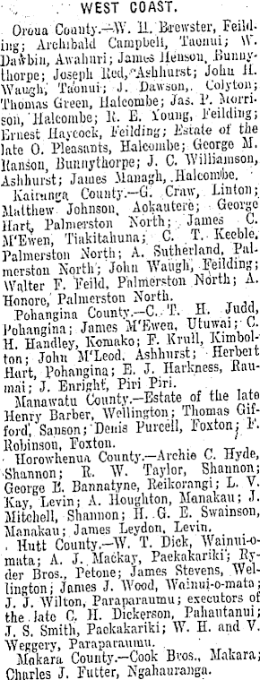 •■;, '-.•'■ WEST COAST. . Oroua County.-W. 11. Ba-ewster, Feililing; Archibald Campbell, Taoinu; W.I DaiVbin, Awahnri; Jamts lleusou. Bunuythorpe; Joseph Johu H. Waiigh,' Taunui; J. Dawson,. CoJytoii; Thomas Green, Hatconibe; Jas. P. M<jmsoii,'Halcombe; K. E. X'oung, Feildnig; Ernest Havcock, Feilding; Esmle ot the late O. Pleasants, Halconibe; Georgo M. ltansou, Buiinythorpe; J. C. Williamson, Ashhurst; James Managh, .Halconnbe. ■ KatruiH'a County'.-G: Craw, Linton; Matthew Johnson. Apkautere; George Hart Palmereton North; .. James -U M'Ewen, Tiakitahuna;. - C. .T. - Keeble. Palmerston North; A. Sutherland Palmerston North'; John ding; Walter F. l r eild, Palmerston North; A. Honore,' Palmerston North. Pohangina County.-C, T, H, Judd, Pohangina; James M'Ewen, TJtuwai;- C. H. Handley, Komako; P. Krull, lumbolton; John M'Leod. Ashhurst; Herbeit Hurt, Pohangina; E. J. Harkness, llaumai; J. Enrighf, Piri Pm. Manawatu County-Estate of the late Henry Barber, Wellington; Thomas Gilford', Sanson;'Denis Purcell, I'oxtonj X. Robinson, Foxton. ■ Horowhenua County-Archie C. Hyde, Shannon; E. W. Taylor, Shannon; George I). Bannatyne, Reikorangi; L. V. Kay Levin; A. Houghton, Manakau; J. Mitchell, Shannon; H..G. E.,Swainson, Manakau; James Leydon. Leviu. _ _ , Hutt Couuty.-W. T. Dick, AVainui-o-mata; A. J..Mackay, Paekakanki; Ryder Bros., Petone; James Stevens, Wellington; James J. Wood, W«inui-o-mata; J J Wilton, Paraparaumu; executors ot theJato C. H. Dickerson, Pahautanui; J. S. Smith, Paokakariki; W. H. and V. WeEgery, Paraparaumu. . ' ■ Mnkara County-Cook Bros., Makara; Charles J. Futter, Ngahauranga.