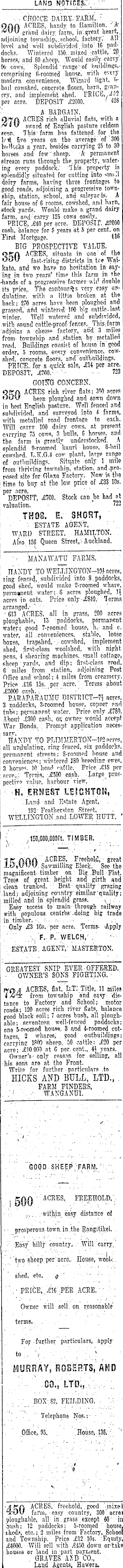 UAN3 NOTIOESi. ■" -. ■ CHOICE DAIRY.-X4RM., : .. fjnn ACHES, handy to Hamilton. • A-. "'w" grand dairy, farm, in:sreat heart,, adjoining township,.school, .factors'.' Air. level' and.--well subdivided into" 16 pad-' docks.. 'Wintered 150.. mijtcd.-.cattle, 20 horses* aad SO sheep. Would easily -carry. 90 cows. 'Splendid'Mnge-of-buildings,-comprisi]ig (i-roomed house, with every modern convenience. AViaard light, d'bail cowshed, concrete floors, barn, gvanery, and implement shed. FRICE v ~r2 per acre. DEPOSIT X2OOO. ' *'% A BARGAIN. ACRES rich alluvial flats, with a ■" ' v sward of English pasture seldom eewi. This farm has fattened, for the \ft five years on the average of 300 buHocks ayear, besides carrying 25 to 30 horses and few'sheep. A- ■permanent stream runs through tlip. property, watering every paddock' This. property is splendidly situated for cutting into *m>. 11 dairy farms, having three frontages to good.roads, adjoining a progressive township, station, school,, and saleynrls. . A fair house of 6 rooms, cowshed, ami Kirn, stock yards. Would make a grand dairy farm, and carry 125 cows easily. PRICE, M 0 per acre. DEPOSIT. 4SOOO cash, balance for 5 years at 5 per cent, on 'First Mortgage. t-lfi BTG 'PROSPECTIVE VALUE. QKA ACRES, situate in ones' of the ««V fast-rising dLotricte m t,-? Waikato, and wo havp no hesitation in anying in two years' .time this farm in .the -hands of a progressive farmer »U'. double its pn'ce.. The contours very easy nndulatinir. with n. little broken at the back; 2"0 acres have been ploughed and graswd, arid winterwHOO big cattle.. lnst winter. Well watered and subdivided, with sound cattle-proof- fence?.,. This/form adjoins a chess* factory, and 3 miles fronv township and ..station by. metalled road. Buildings consist of house in good order, 5 rooms, ev;rj convenience, cowshed, concrete floors, and" outbuildings. PRTCE. for a quick sale, £U per acre. DEPOSIT, .£7OO. ■•'■ • — - 723 GOIMS CONCERN. QKfl ACRES rich river flat?: 3W ncres OuW been ploughed and sown down in best English pasture.. Well .fenced and subdivided, and surveyed into 4 farms, with metalled road frontage to each. Will carrv 100 dairy cows, at present cirrying 75 cowe, 3 bulls, G horses, and tho farm is greatly understocked". A splendid fl-roomed kauri house, 8-bnil cowshed. L.TC.G.4 cov-- plant, large range of outbuildings. Situate only 1 mile from thriving township, station-, and-.nro-. rosed site for Crlnxo Factory. Now is the time to buy sit the low price of .£33 10s. per acre. DEPOSIT, ,£7OO. Stock can be had at valuation. ■ '23 THOB. E.-' SHORT, '• ESTATE . AGENT, WARD STREET, HAMILTON. A1V0.156 Queen Street,-Auckland. ' , iFANAWATU FARMS. ITANDY TO WELLTNGTON--10} acres, ling fenced, subdivided into .B.paddocks, good shed, would make 2-roomed whare, permanent water;. G acres ploughed, H acres in oats. Price only <£840.- Terms j arranged. , ' ; ■ ■• ■' ■ 613 ACRES, all in. grass, 200 acres.| ploughable, 15' paddocks, .permanent watert good 7-roomed house, h.. and c. water, ail .conveniences, stable, loose boxes, trapsJied, -.■-cowshed, implement shed, fir?t-cli)ss woolshed. -with night pens, 4'shearing machines. «mnll c-otlage, sheep ■ yards, ■ and 'dip; first-class road, G miles from station, adjoining Poet Office and school; 4 miles from creamery. Price .£lO. 15s. per acre.' Terms about ,£3OOO c.ish. ' "' ■" • PARAPARAUSU. acres., 3 naddocks, 3-roomed house, cojmer and tubs; ,pe.niianpnt water. Price only ,£7BO. About .£3OO cash, oi; owner would accept War Bonds. '. Prompt application neces""iTAXPY TO PLna.fERTON-102ocrPS, all undulating, ring fenced, six paddocks, permanent stream; S-ronmfd house and convenience; wintered 180 breedinsr ewes, 3 horse'. 10 , lientl f-aftle. Price. £\S per aero.,-: Terms, £M cash. -Large prospective va]up, harbour view. '' H. ERNEST LEtGHTCN. " ; ; Land ■ and Estate Agent, • . ~ IS2- Feat'ncrston Street, WELLINGT ON. and -LOWER HUTT. ' V /-IEO.OOO.OOOft. TIMBER. ' 1 K fiCifi-' ACKES > Freehold ■ great .J.O,\i<W. Sawmilling Eloct. See the magnificent- timber oh Biff 'Bull Flat. Trees of great, height and girth and clean tr'unknd. Best' ; qiiality ' grazing land: adjoining coMritry similar"cjuality; milled and in splendid grass. ''■\; •' . Easy sccesE to' main- through railway with populous, centr'es.doing big trade in'timber. .. ■■ - ■•■ . ■ - . ■ Only IBs. per acre. Terms. Apply ,■':'■; \ ; :f.. P.''WELCH, ; -.-' ■■ ; . ESTATE; AGENT,' MASTERTON. GREATEST SNIP EVER-OFFERED. ■ '- OV/NER'S SONS FIGHTING. ■■ m ACRES, flat, L\T: Title, 11 m'ilM from township and.easy dietnnce to Factory and School; motor roade; 120 acres rich river fiats, balance good black soil; 7 'acres bush, all ploughable ; seventeen well-fenced paddocks; one 5-roomed houm ; 3 and 4-roomed cottages, 2 wharee, . jood outbuildings; carrying IRW sheep,'M cattle; per acre; £\0 000 at C per. co.nt., H years., Owner's-only reason for .Gelling, all ■his sons aro at tho Front; Write for further ■ particulars in HICKS AND BULL, LTD., . FARM FINDERS, . ; .'•' ■ WANGANTJI. ' - V •■ . y • . ' ' "'.' ■ '■ " ■'"'}.■'■■ ■ '"■' GOOD SHEEP.•FARM.' V I KOO ACEES ' FEEpTOLD,'.. . .. ...... .within easy distance of i • ■ ■ prosperous -town in. the Rangitikei. . • ■•' Easy hilly' "country,-.-■ Will 'carry. ,' ' two sheep per'acre.. House, wooU'.. slied, etc. , 0 " ; • ". ■ PRICE,;. .£I6; ; PER ACKE.'' '. • Owner will sell, on reasonable' terms.. . . For - further particulars, apply : to.-.. '; .•: "'."'■ ;';:'. * MURRAY, ROBERTS, AND ;■ ■'■■ ' CO., LTD;, -^•:.../■:. .. : BOXS2, FEILDING. ■ '.'■ . .'' '" Telephone Nos.:- ■ ■■ . . Office, 95. .H0u5e,.136.. ■' ' i . ■ ■'.■■ 1, ' ..'■.";.;■'?. , ," ■ ■ ; ■ ' v ; .."'.■. ; 1 'A Kfi ACRES, froehold, ; good iriixpl - TlrOl/. farm, easy country, 800" acre I ' p
