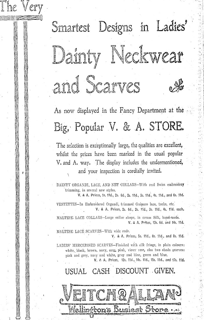 J I Smartest Designs in Ladies ■I' • ■ ' As now displayed in the Fancy Department at the - j I I Big/ Popular V. &A. STORE. . ; \ The selection is. exceptionally large, the qualities are.excellent, ; fj j whilst the prices have been marked in the usual popular | I ' V, and A, way, The display includes the undermentioned, \ t \ and your inspection is cordially invited, . ' I N . ..-.| j ■ DAINTY ORGANDI, LACE, AND NET COLLATCS-With real Swiss embroidery ■ J . . trimming, in several new styles. Ml V. &A. Prices, Is. 11d., 2s. 6d., 2s. 11d., 3s. 11di, 4s. 11d., and 6s. 11d. ' ' VESTETTES—In Embroidered Organdi, trimmed Guipure luce, tucks, etc' ~ •-•; ' S V. & A. Prices, 2s. 6d., 2s. lid., 3s. 11d., 4s. 11d. each. ' : . . MALTESE-LACE COLLARS-Large sailor shape, in cream Silk, hand-mnde. . :':' J ( V. &A. PrJMs, 13s. 6d. and 14s. 11d. MALTESE LACE.SCARVES-Withwide ends. ' "... \ ' .' V. &A, Prices,-ss. lid., 6s. 11d., and Bs. Ltd. ■'.■"' LADIES' MEiRCEIUSED SCARVES-Finished with silk fringe, in plain colours: \ white, black, brown, navy, sa\a, pink, vieux , rose, also two shade, scarves! \\ ' pink and grey, navy and white, groy and blue, green iind blue. ~; I , . " V. I: A. Prices, 13s. 11d., 14s. lid., 15s. 11d., and 17s. 11d. -^" j USUAL CASH DISCOUNT .GIVER I ;■ : Vμ mi. - iiii.i.n.i. in, 4 'f*- "■■■■ -rf"%iß ' '- ■ ■ ' • WelliK^o^s..Busiest , Shove. ' ;-