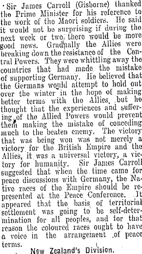 •Sir James Carroll (Gisborne) thanked the Primo Minister for his rcferenco to tho work of tho Maori soldiers. Ho said it would not bo surprising if during tho next week or two, there would be more good news. Gradually the Allies were breaking down the resistance of the Contnil Powers. They were whittling away the countries that had made, tho mistake of supporting Germany. Ho believed that the Germans wqtild attempt to hold out over tho winter in tho hope- of making better terms with tho Allies, .but he thought tiiat the experiences and suffering w of the Allied Powers would prevent them making tho mistake of conceding much to the beaten enemy, Tho victory that was being won was not merely a victory for the British Empire and tho Allies, it. was a universal victory, a victory for humanity. Sir James Carroll suggested that when the. time came for peace discussions with Germany, the Native races of the Empire should be represented at the Peace Conference. . .It appeared that the basis of territorial sottloment was going to bo self-deter-mination for all peoples, and tor that reason the coloured races ought to have a voice in the arrangement .of peace terms. . i. . New Zealand's Division.