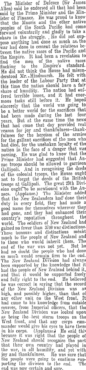 The Minister of Defence (Sir James Allen) said ho endorsed all that had been said by the Mine Minister and the Minister of Finance. He was proud to know that the Maoris and the other native peoples of the South Pacific lied come forward voluntarily and gladly to take a share in the struggle. .Hβ did not suppose anything had done as much as, the war had done to cement the relations between the native races of the Pacific and the Empire. It had been a revelation to find the men of tho native races Hocking to the Empire's standard. He did not think the House had misunderstood Mr..Hindniarsh. Ho felt with the leader of tho Labour Party that ftt this time the nation should havo a fair share of humility. Tho nation had suffered terrible losses, and it had enormous tasks still before it. . He hoped sincerely that the ' world waß going to be a better world for the sacrifices that had been mado during the last four years. But at the same timo the news that had como that day provided real ■reason for joy and thankfulness—thankfulness for the heroism of tho armies for the gallant sacrifices of .the men who had died, for the unshaken loyalty of tho nation in the face of a'danger that was passing. Ho was glad to know that the Prime Minister had suggested that Anzac troops should be allowed to garrison Gallipoli. And in recognising tho deeds of the colonial troops, the House ought not to forget the deeds of the British troops at Gallipoli. The groat 29th Division ouglrfto bo mentioned with the Anzacs. (Applause.) Thu Minister added that the Now Zealanders ha* done their duty in every field, they had made a good name for themselves wherever they had gone, and they had enhanced their country's reputation' throughout the world. Tho soldiers of New Zealand had gained no fewer than 3740 war distinctions. Thosi! honours and distinctions meant much to tin , people of Now Zealand and to' those who would inherit them. Tho end of the war was not yet. But ho had no doubt the people who had done so mucTi would firm to tho end. The i\'ew Zoalaml Division had always been supported by tho knowledge that it had Iho people of New Zealand behind it, ami that it would bo supported freoly and fully right to Iho end. Ho believed he was correct in Kiying that the record of the Now Zealand Division was a-s high, and possibly higher, than that of any oilier unit on tho West front. It had come to his kuqwledKO from outside sources, from Imperial officers, that tho New Zealand Division was looked upon as being Iho • best storm troops on tho West front, and that any corps commander would give his eyes to havo them in his corps. (Applause.} Ho said this becauFt! it was right that the people of Now Zenland should recognise tho part that their , own country had played in tlie war, in all humility, and yet with joy and thankfulness. Ho was sure that tho people were going to continue supporting tho division to J lie pud. Tile end was now certain and sure.
