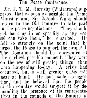 The Peace Conference, Mr. J. T. l\l. llornsby (Wairai'apn) suggested that us soon as possible the Prime Minislm , and Sir Josopli Ward should return to the Old Country to take part in tlio peace negotiations. "They should get back again as speedily as any vessel can take them," ho remarked. Jli! felt m> strongly on llio jjoint Hint ho urged the Ilouso to support the proposal. The Dominion should "Bo represented at thu earliest possible moment. They were, on tlio ovo of still greater things thnn were, happening Uwlay.' A crisis had oncurred, but a still greater crisis was near at hand. Tic had made a suggestion,' and ho believed that the. people of tlio country would support it by demanding tho presence of its ropresontatives ill tho councils of (ho Empiro in