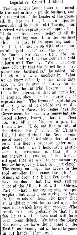Legislative Council Jubilant. The Legislative Council was in no mood to transact ordinary public business, and the suggestion of the Leader of the Council, Sir b'raucis Hell, Unit an adjournment should be made until Tuesday, was received with expressions of approbation, "i do not feel myself to-day at all lit to do anything more than tlio business which has just fallen upon us, and J. feel that it must ))e so with other honourable gentlemen," said the Lender of the Council, Sir Francis Bell. Jle proposed, therefore, that the Council should adjourn until Tuesday. "We do not even know onicially that the Allied Heels have passed the .Dardanelles," he added, "although we know it unofficially. What we do know oflicially is that some days ago, on the request of Turkey for an armistice, tlio Imperial Government and the Allies determined that an armistice, if granted, should be the equivalent ot capitulation." The terms of capitulation of Turkey would be decided not at Mudros, but in Paris. I/or some days the Government had sat in a somewhat enforced silence, knowing that the Fleet was assembling at iludros to pass the Dardanelles. "I do not like to talk of the. British Fleet," added Sir Francis Bell, "1 should think the Fleet is. composed more'of Allied ships than of our own. Our fleet is probably belter' occupied. What X want honourable gentlemen to recognise is that it ie not merely the passing of this historical spot that we wish to commemorate, but wo have, every Black Sea port closed. Tlie enemy no longer has access to the food supplies that camo through Asia Minor, or from the Black Sea ports. I have no doubt thaj; the next resting place of tho Allied Fleet will be Odessa. Part of what J. am saying may be apocryphal, but what I am saying has been in tho minds of those who knew that an armistice might be granted upon, the' conditions which liavo been reported. The result will most probably bo that in a few hours what I have said will have been accomplished. Wo have the Black Sea coast, we have the channel of the East in our hands, and we have the game in our hands." (Applause.)