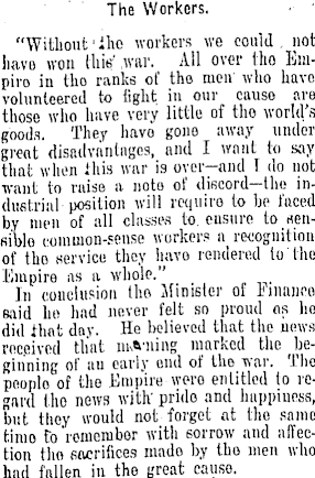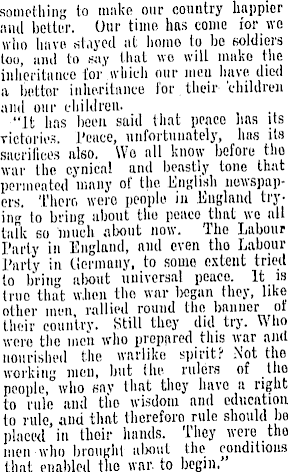 something to make our country happier and better. Our time has come for we who have stayed at homo to bo soldiers too, and to say that wo will make the inheritance for.which our men have died a bettor inheritance for. their 'children and our children. "It has been said that peaco has its victories. Peace, unfortunately, has its sacrifices also. Wo all know before tho war the cynical and beastly tone that permeated many of the English newspapers. Their, wero people in England tryin<* to bring about the peaco that we all talk so much about now. The Labour Party in England, and even tho Labour Party in Germany, to some extent tried to bring about universal peaco. It is true that wJien tho war l>cgan they, like other men rallied round the banner ot their country. Still they did try. Who wero the men who prepared this war and nourished the warlike spirit? Not the working men, but the rulers of tio people, who say that they have a right to rule and tho wisdom and education to rule, and that therefore rule should be placed in their hands. They were tho men who brought about the conditions that enabled the war. to begin.