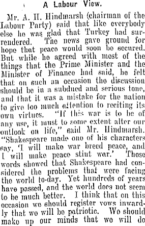 \ A Labour View. Mr A IT Hindmarsh (chairman of the Labour Party) enid that like everybody else ho was. glad that Turkey had surrendered. Tho noivs gave ground for hope that peace would soon bo eeenred. But while he agreed with, most of the things that tho Prime. Minister and the Minister of Finance had enid, he felt that on finch an occasion tho discussion should bo in a subdued and serious tone, and I hut it was a mistake for the nation lo give 100 much attention to reciting its own virtues. "If I his war is to be of any use it must to some extent alter our outlook'on life," eaid Mr. lliudinarsli. "Shakespeare made ono of his characters eay, 1 will mako war breed peace, and t' will mako peace stint war.' Those words showed that Slwkcspouro had considered the problems that were facing tho world to-ilay. Yet hundreds of years have passed, and the world does not seem to be much better. I think that on this occasion wo should register vows inwardly that wo will bo patriotic. Wo should mako up our minds that wo will do
