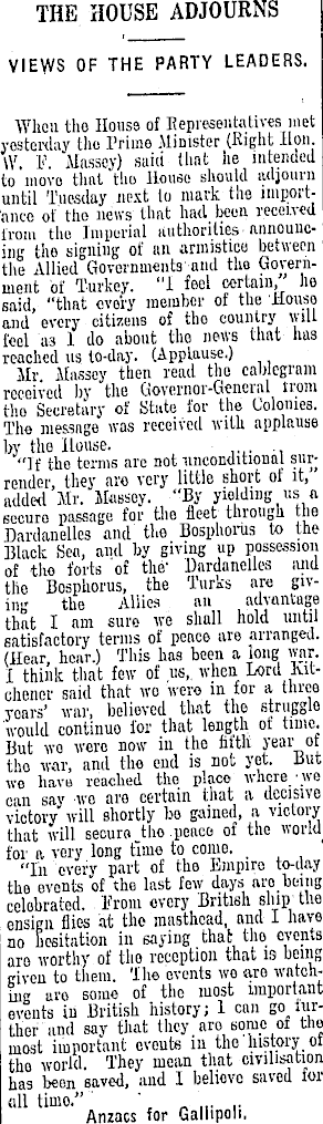 THE HOUSE ADJOURNS VIEWS OF THE PARTY LEADERS. When tho House of Representatives met yesterday tho Prime Minister (Bight Hon. \V. l< , . Massey) saici Hint he intended to movo that tho House should adjourn until Tuesday next to mark the lmport'ance of the news that had been received from the Imperial authorities, announcing tho signing of an armistice between the Allied Governments and the Government of Turkey. "I feel certain, he said, "that every member of the Jiouso and every citizens of tho country will feel as 1 do about the news that has reached us to-day. (Applause.) Mr Massey then read tlio cablegram received by the Governor-General trom tho Secretary of State for the Colonies. The message was received with applause by the House. "If tho terms are not unconditional sur; render, they aro very little short ot it, added Mr. Massey. "By yielding us a sccuro passage for the fleet through the Dardanelles and the Bosphorus to the Black Sen, and by giving up possession of tho forts of the' Dardanelles and tlie Bosphorus, the Turks are giving the Allies an advantage that I am sure we shall hold until satisfactory terms of peace are arranged. (Hear, hear.) This has been a long war. I think that few of us,, when Lord Kitchener said that wo wero in for a three yoars' war, believed that the struggle would continuo for that length ot time. But wo wero now in the fit tit year of tho war, and the end is Dot yet. Jiut we have reached tho place where ■Wβ can say wo are certain that a decisive victory will shortly bo gained, a victory that will secure tho peaco of the for a very long time to come. "In every part of the Empire to-day the events of the last few days are being celebrated. From every British ship tlie ensign flies at tho masthead, and I have no hesitation in saying that tho events are worthy of tho reception that is being given to them. 'Ihe events wo are watcnuiK aro some of the most important events in British history; 1 can go further'and say that they aro some of tho most important events in the history, of tho world. They mean that civilisation has been saved, and I beliovo saved ior Anzacs for Gallipoli.
