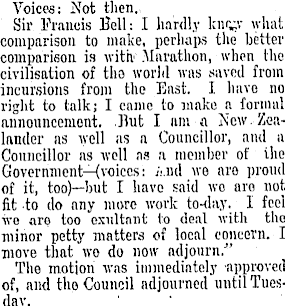 Voices: Not then. Sir Francis Bell: I hardly what comparison to make, perhaps the better comparison is with l Marathon, when the civilisation of the world was saved from incursions from the East. I have no right to talk; I came to make a formal announcement, But I urn a Ncw--Zea-lirader as well as a Councillor, and a Councillor as well as n. member of ihe Government-^voices: And we are proud of it, too)—but I have said wo aro not. fit to do any more work to-day. 1 feel ive are too exultant to deal with tho minor petty matters of local concern. I move that wo do now adjourn.-" The motion ivas immediately approved of, and the Council adjourned until Tuesday.