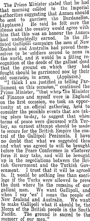 The Primo Minister stated that he had' that morning cauled to the Imperial authorities posting that Anzacs should bo sont to garrison he Dardanelles (Applause.) Ho said he felt sure the House and tho country would agree- with him that this was an honour the Anzacs • had undoubtedly earned. In the illfated GaltipmT campaign the men of New Zealand and Australia had proved themselves to be'soldiers second to nono in tho world, and it would bp a fitting recognition of tho deeds of tho gallant dead that the ground on, which they had. fought should be garrisoned now. by their old comrades in arms. (Applause.) "I think 1 am. justified in telling Parliament on this occasion," continued tho Prime Minister, "that whe?*ho Minister of Finance and .myself were in England on the first occasion, wo took an opportunity at an, official gathering, held to consider the possiblo events that are taking place to-day, to suggest that when terms of; peace were discussed with Turkey, an earnest attempt should be mado to secure for tho British Empire the control of tho Gallipoli Peninsula. I liavo no doubt that what we suggested then and what was agreed to will be brought before the Peace Conference in whatever form it may take, and will be brought up in the negotiations between the British Government and the Turkish Government. I trust that it will be agreed to. It would bo nothing less than sacrilege if-the Turks were , allowed to press tho dust where lio the romains of our gallant men. We want Gallipoli, and when I say 'we' I mean tho people of New Zealand and Australia. We want to make Gallipoli what it should be, the Mecca of the British people in the South Pacific. Tho ground is sacred to tho memory of our men."
