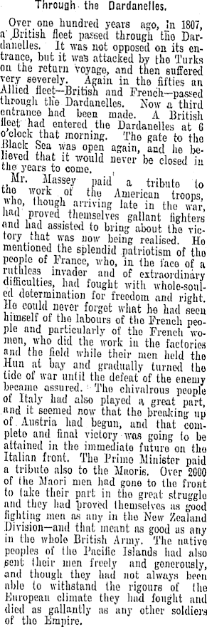 Through the "Dardanelles. Over one hundred years ago, in 1807, a'.British fleet passed through tlio Dardanelles. It was not opposed on its entrance, but it was attacked by the Turks on the return voyage, and then suffered severely. Again in the fifties an Allied fleet-British and French-passed through the Dardanelles. Now a third entrance had been made. A Britisli fleet'had entered the Dardanelles at G o clock that morning. The gate to tho lilack Sea was open again, and he believed that it would never be closed in the years to come. Mr. Massey paid a tribute to wiin T k i Ot W American troops, who, though arming late in the war, had proved themselves gallant fighters and had assisted to bring about the victory that was now being realised. Ho mentioned the splendid patriotism of tho people of 1 ranee, who, in the face of a vk ; ??• ln T ader and of extraordinary difficulties, had fought with whole-soul-ed determination for freedom and right Hβ could never forget what he had seen Himself of tho labours of the French people and particularly of the French women, who did the work in the factories and tho field while their men held the Hun at bay and gradually turned tho lido ot war until the defeat of the enemy became assured. '- Tho chivalrous people of Italy had also played n great part and it seemed now that tho breaking up of Austria had begun, and that completo and final victory was going to be attained in the immediate future on tho Italian front. The Priino Minister paid a tribute also to the Maoris. Over 2000 of Ihe Maori men had gone to the front to take their part in tho great struggle and they had proved themselves as good fighting men as any in the New Zealand Division—and that meant as good as any in the whole British Army. The native peoples of the Pncilic Islands had also sent their men freely and gonoronely, and though they had not always been able to withstand the rigours of the European climate they had fought and died as gallantly as any other soldiers of tho Empire.