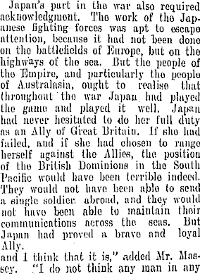 Japan's purt in tho war also required acknowledgment. Tho work of tho Japanese lighting forces was apt to escape attention, because it had not l>een done on tho battlefields of Europe, but on the highways of tho sea. But the people of tho Empire, and particularly tho peoplu of Australasia, ought to roaliso that throughout tho war Japan, had played the game and played it well. Japan had never hesitated to do her full duty as an Ally of Great Britain. If she had failed, and if she had chosen to range herself against tho Allies, the position of the British Dominions in tho South Pacific would lmvo been terrible indeed. They would not have been ablo lo send iv single soldier, abroad, and th«y would not luivo boen able to maintain their communications neross tho sens. But Japan had proved n bravo and loyal Ally. and 1 think that it is," added Mr. AUssey. "1 do not thiuk any man in any