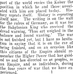 part of the world envies tho Kaiser the position in which lie and tlios«\ associated with him arc placed to-day. History repeats itself. History is repenting itself now. The writing is on tho willt lor the rulers of Germany, as it was for the Babylonian King who received the dread -warning, 'Thou art weighed in the balance and found wanting. . The war is not finished yet, but J. have no hesitation in saying that it is on the eve of being finished, and on an occasion like this citizens of the. Empire should remember the Higher Power that has guided us and hoe directed us as peoples, as an Empire, and as individuals, during the four years of war that we have experienced." I