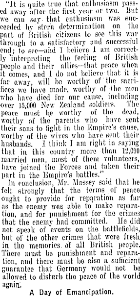 "It is quite true that enthusiasm passed away after the first year or two. Hut we can ,s«y. that enthusiasm was succeeded by stern determination on the part of British citizens to see this war through to a satisfactory and successful end; to see—aiid I believe I urn correctly 'interpreting tho feeling of British people and their allies-Hint peace when it conies, and I do not believe that it is far away, will bo worthy of the sacrifices we have made, worthy of the men who have died for our cause, including -over 15,000 New Zealand soldiers. The peace must b,e worthy of the dead, worthy of tho parents who have sent their sons to light in the Empire's cause, worthy of the wives who have sent their husbands. I think I. am right in saying that in this country more thnii 12,0011 married men, most of them volunteers, have joined the I'orces and taken their ; part in tho 'Empire's battles." In conclusion, Mr. Massey said that he fell, strongly that tho terms of peaco ought to provide for reparation as far as the enemy was able to make reparation, and for punishment for tho crimes that the enemy had committed. Me did not speak of events on the battlefields, but of the other crimes that were fresh in the memories, of all British people. There must bo punishment and reparation, and there must bo also a suliicicnt guarantee that Gormony would not bo allowed to disturb tho peaco of the world again. A Day of Emancipation.