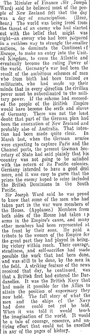 •Tho Minister of Finance (Sir /Joseph Ward) said he 'believed most of the people of New Zealand felt that the day was a day of emancipation. (Hear, hear.) Tho world was being freed from tho threat of an unemy who had started out with tho belief that might was right—an enemy who had been pwpared in a ruthless way to strangle the smaller nutioiis, to dominate the Continent <f Europe,.to make an entry into the "United Kingdom, to cross the Atlantic and eventually become tho ruling Power of tho world. Germany's war had been the result of the ambitious schemes of men who from birth had been trained, os militarists, who had mi'.de up their minds that in every direction the civilian power must bo subordinated to the military .power. If the scheme had succeeded the people of. tho British Empire would have become the serfs and slaves iof Germany. There was not tho least doubt that part of tho German plan had been the annexation of New Zealand and probably also of Australia. That intention had been made quite clear. In March last, when the German armies were expecting to capture Pai'is and the Channel ports, the present German Secretary of State had said plainly that his 'country was not going to bo satisfied with the return of its Pacific colonies. Germany intended to have- a good deal more, and it was easy to guess that tho prizes the enemy hoped to seize included tho British Dominions in tho South Pacific. Sir Joseph Ward said ho was proud to know that some of tho inon who had taken part in the war wore members of tho House. (Applause.) Members from both sides of tho House had taken i p arms in the Empire's cause, and many other members had been represented at tho front by their sons. Ho paid a tribute to tho women pf ( tho Empire- for tho great part they had played in bringing victory within roach. Their courage, steadiness, and self-sacrifice had made possiblo the work that hud been done, and was .still to be done, by tho men in tho field. A striking feature of tho news received that day, he continued, was that a British fleet had entered tho Dardanelles. It was the British Nn.vy that had made it possible for tho Allies to attain tho position . of supremacy they now held. Tho full story of what the men and the ships of the' Navy had done could not yet bo told. When it was told it would touch tho imagination of the world. It would bo a tale of courage, resource, and untiring effort that could not bo excelled in any of tho pages of history.