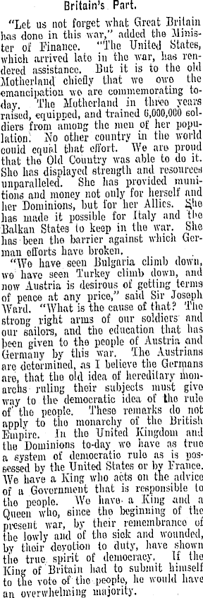 Britain's Part. "Let us not forget what Great Britain has done in this war," added the Minister of Finance. "The United .States, which arrived lato in tho war, has rendered assistance. But it is to the old Motherland chiefly that wo owe- the emancipation wo are commemorating today. The Motherland in tliueo years raisud, equipped, and trained 6,000,000 6oldiers from anions the men of her population; No other country in the world could equr.l that effort. We are proud that the Old Country was able to do it. Sho has displayed strength and resourced unparalleled. She lias provided munitions and money not puly for herself and her Dominions, but for her Allies. Sfie lias made it possible for Italy and the Balkan States to keep in the war. She has been the barrier against winch German efforts have broken. "■Wβ have seen Bulgaria climb down, we have seen Turkey climb down, and now Austria is desirous of getting terms of peace at any price," said Sir Joseph Ward. "What is the cause of that? The strong right arms of our soldiers and our sailors, and tho education that has been given to the people of Austria and Germany by this war. The Austrians are determined, as I believe the Germans are, that the old idea of hereditary nionarchs ruling their subjects must givo way to the democratic idea of tho rule of' the people. These remarks do not npply to tho monarchy of the British Empire, in the United Kingdom and tho Dominions to-day wo have as true a system of democratic rule as is possessed by the United States or by France. We have a King who acts on the advice of a Government that is responsible to tho people. Wo havo. a King and a Queen who, since the beginning of the present war, by their remembrance of the lowly and of the sick and wounded, by their devotion to duty, have shown the true spirit of democracy. If the King of Britain had to submit himself to the vole of tho peoplo, he would have an overwhelming majority.