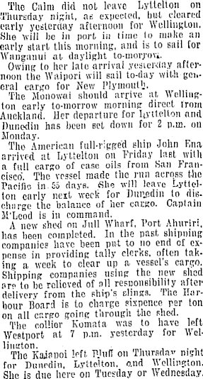 The Calm did not leave Lyltcltoii on Thursday night, ae expected, but cleared early yesterday afternoon for Wellington. She will be in port in lime to make an early start this morning, and is to sail for Wnnganui at daylight to-morrovi. Owing to her late arrival yosieixlay afternoon the Waipori will sail to-day with general cargo for New I'lymoutlj. The Monowai should arrive at Wellington early to-morrow morning direct from Auckland. Her departure for Ij.yiteHon and Dunedin has been Bet down for 2 n.m. on Monday. Tho American full-rigged shin John Kna arrived at Lyttelton on Friday liiet with a full cargo of case oils from Han Francisco". The vessel made the run across the Pacific in. Jo days. She will leave Lyttelton early next week for Dimedin to rtischiirge the balance of her cargo. Captain M'Lcod is in command. A new shed on .lull Wharf, Port Ahuriri, has been completed. In the pant, shipping companies have been put to no end of expense in providing tally clerks, often taking a week to clear up a vessel s cargo. Shipping companies using the new shod or« to be relieved of nil responsibility after delivery from the ship's clings. The Harbour Board is to charge sixpence per ton on all cargo going through the shed. The collior Komata was to have left Wcstport at 7 p.m. yesterday for WelTho Kajsnoi left P-Jiifi on Thursday niffht for Dunedin, Lyttelton. o.nd Wellington. She is due here on Tuesday or Wednesday.