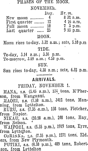 PHASES OF THE MOON. NOVEMBER. Day. Br. m. New moon 4 8 32 a.m. First Quarter 12 4 16 a.m. Full moon 18 7 3 p.m. Last quarter 25 9 55 p.m. lIOON. Moon.rises to-day, 3.32 a.m.; Ects, 6.10p.m TIDE. To-day, 3.14 a.m.; 3.36 p.m. To-morrow, 3.59 a.m.; 4.20 p.m. SUN. Sun riees to-day, 4.38 a.m.; setF, 6.32 p.m. ARRIVALS. FRIDAY, NOVEMBER 1. MANA, s.B. (5.45 a.m.), 134. tons, M'Pherson, from Wanganui. MAORI, s.B. (7.10 a.m.), 3412 tone, Manning, from Lyttelton. 11UKU, 5.6. (7.35 a.m.), 158 tons, Fletcher, from Napier. NIKAU; s.b. (10.50 a.m.), 248 tons, Hay, from Nelson. ' WAIPOUI, 8.8. (5.35 p.m.), 1919 tone, Eyre, from Lyttcjton. CuniiNNii, 13. (7.35 p.m.), 1271 lons. Elders, from New Plymouth. PUTIKI, 8.8. (8.30 p.m.), 409 tons, Kobcrtson, from Lyttelton