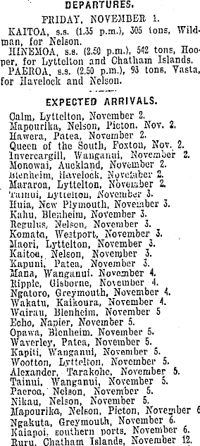 DEPARTURES. FRIDAY, NOVEMBER 1. KAITOA, s.s. (1.35 p.m.), 305 tons, Wildman, for Nelson. HINEMOA. s.s. (2.J0 p.m.), 542 tons, Hooper, for Lyttelton and Chatham Islands. PAEROA. 8.3. (2.50 p.m.), 93 tonß, Tasta, for Havelock and Nelson. EXPECTED ARRIVALS. Oalm, Lyttelton, November 2. Mapourika, Nelson, Picton, Nov. 2. Hawera, Patea, November 2. Queen of the South, Foxtou, Nov.. 2. lnvercargill, Wauganui, November 2. Monowai, Auckland, November 2. iukmheim, Havelock, Novuiaber 2. . Mararoa, Lyttelton, November 2. Tiuuui, Lyueliou, November 3. Huia, New Plymouth, November 3. Kahu, Blenheim, November 3. Reguhts.. Nelson.. November 3. Komata, Wc3tport, November 3. Maori, Lyttelton, November 3. Kaitou, Nelson, November 3. Kapuni, Patea, November 3. Mana, Wanganui. November 4. Ripple, QUborne, November 4. Ngatoro, Greymouth, November 4. Wakatu, Kaikoura, November 4. Wairau, Blenheim, November 5 Echo, Napier, November 5. Opawa, Blenheim. November 5. Wavericy, Patea, November 5. Kapiti, Wanganul, November 5. Wootton, Lyttelton, November 5. Alexander, Tarakolie, November 5. Tainui, Wanganui, November 5. Faeroa, Nelson, November 5. Nikau, Nelson, November 5. Mapourika, Nelson, Picton, November 6, Ngakuta, Greymouth, November 6. Kaiapoi. southern ports. November 6. Buru, Chatham Mandß, November 12.