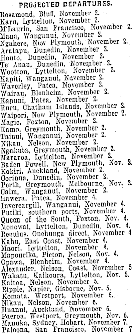 PROJECTED DEPARTURES. Rosamond, Blufl, November 2. Karu, Lytteltou, November 2. M'Laurin, San Francisco, November 2. liana, Waugunui. November 2. Ngahore, New Plymouth, November 2. Aratapu, Bunedin, November 2. Kouto, Dunedin, November 2. Te Anau. Dunedin. November 2. Wootton, Lyttelton, November 2. Kapiti, Wanganui, November 2. Waverley, Patea. November 2. Wairau, Blenhciin. November 2. Kapuni, Patea, Novembers. Iluru, Chatham Islands, November 2. Waipori, New Plymouth, November 2. Magic, Foxton, November 2. Kamo. Greymouth, November 2. Tainui, Wanganui. November 2. Nikau Nelson, November 2. Nealtuta, Greymouth, November 2. Jlararoa, Lyttelton, November 2. Baden Powell, Now Plymouth, Nov. 2. Kokirl, Auckland, November 2. Oorinna, Dunedin, November 2. Perth, Greymouth, Melbourne, Nov. 2. Calm, Wanganui, November 2. Hawera, Patea. November 4. Invercargill, Wanganui, November 4. Putiki southern ports, November 4. Queen of tho South, Foxton, Nov. 4. llonowai, Lyttelton, Dunedin. Nov. 4. Reculus. Onehunga direct, November 4. Kahu, East Coa6t. November 4. Maori, Lyttelton, November 4. Mnpourika, Picton, Nelson, Nov. 4. Opawa, Blenheim, November 1 Alexander, Nelson, Coast, November 5. Wakatu, Kaikoura, Lyttolton, Nov. 5. Kaitoa, Nelson, November 5. Ripple, Napier, Gisborue, Nov. 5. Komata. Westport, November 6. Nikau, Nelson, November d. Iluanul, Auckland, November 6. Paeroa, Westport, Greymouth, Nov. 6. Manuka, Sydney. Ilobart, November 7. Paloona, San Frnncisco, November 7.