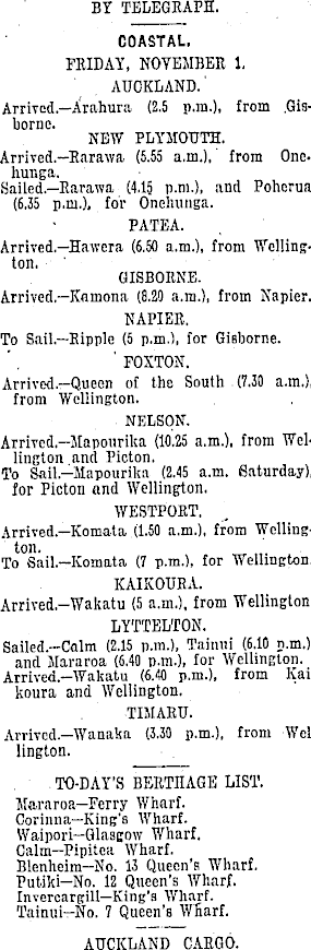BY TEI/EGKAPH. . COASTAL. FKIDAY, NOTEMBEK 1. AUCKLAND.' Arrived.—Arahura (2.5 p.m.), from .Gisborne. NEW PLYMOUTH. Arrived.-Rarawa, (5.55 a.m.),' from One. hunga. Sailcd.-Earawa (4,15 p.m.), and Poherua (6.35 p.m.), for Onehunga. PATEA. Arrived.—Hawera (6.50 a.m.), from Wellington. ' GISBORNE. Arrived.—Kamona (8.20 a.m.), from Napier. KAPIEK. To Sail—Hippie (5 p.m.), for Gieborne. ' FOXTON. Arrivod.-Queen of the South . (7.30 a.m.), from Wellington. NELSON. Arrived —Maponrika (10.25 a.m.), from Wellington and Picton. To Sail.-Mapourika (2.45 a.m. Saturday), for Picton and Wellington. WESTPOBT. Arrived.—Komata, (1.50 a.m.), from Wellington. To Sail—Komata (7 p.m.), for Wellington. KAIKOUKA. Arrived.-Wakatu (5 a.m.), from Wellington. LYTTELTON. Sailed.-Calm (2.15 p.m.), Tainui (6.10 p.m.), and Mararoa (6.40 p.m.), for Wellington. Arrived.-Wakatu (6.40 p.m.), from Kaikoura and Wellington. TIMARU. Arrived—Wanaka (3.30 p.m.), from Wellington. j . ' . TO-DAY'S BEUTHAGE LIST. Mararoa—Ferry Wharf. Corinna—King's Wharf. Waipori—QlasEOw Wharf. Calm—Pipitca Wharf. Blenheim-No. 13 Queen's Wharf. Putiki—No. 12 Queen's Wharf. Invercarsill—King's Wharf. Tainui-No. 7 Queen's Wharf. AUCKLAND CAEGO.