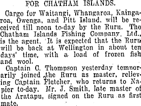 FOR CHATHAM ISLANDS. Cargo for Waitangi, Whangaroa, Kaingaroa, Owenga, and Pitt Island, will bo received till noon to-day by the Bum. Tho Chatham Islands Fishing Company. Ltd., is the agent. 'It is expected thut the Burn will bo back at Wellington in about ten days' time, with a. load of frozen fish and wool. Captain C. Thompson yesterday tomnorarily joined Jthe Euru as master, relieving Captain. Fletcher, who returns to Napier to-day. Mr. J. Smith, late master of the Aratapu, signed on the Euru as first mate.