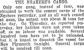 THE NGAHEBE'S CARGO. Only one gang, inetead of four, wae obtained to work the cement cargo of the Ngahore yesterday, and as all work ceased at noon, the output was about 50 tons for the day. On Thursday, as reported yesterday, her hatches were not even takon oft. as no labour was available. Several hundred tons have yet to he unloaded, but it is hoped to dispatch the vessel for New Plymouth to-night. General cargo will be received till noon.
