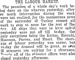 THE LABOUR MARKET. The promises of a whole day's work being done on the wharves yesterday., after bo much interruption during the week woro not realised, /or the momentous newß of the surrender o'f Turkey caused all work to stop at noon for the rest of Tho 'ip.y. All Bhins that were to have saiHl yesterday were put off till to-day, the only exceptions being the Kaitoa, Moeraki, Hinomoa, I'aeroa, and Maori. Tho shortage of labour yesterday was easier, but to-day the demand will bo great, as o»cr 20 steamers arc waiting for a clearance, wnnr'v all of the sl'inninc offices were also closed yesterday afternoon.