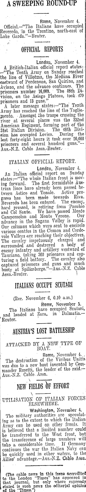 A SWEEPING ROUND-UP Rome, November 4. Official.—"The Italians have occupied Reveredo, in the Trentino, north-east of Lake Garda."—Renter. OFFICIAL REPORTS London, November 4. A British-Italian official report states: —"The Tenth Army on Sunday reached the Hue of Villotma, tho Meduno River eastward of Pordenone, San Quirino, and Aviano and the advanco continues. The prisoners number 18,000. The 48th Division, on the Asingo Plateau, took. 470 prisoners and 13 guns." A later message states :-"The Tenth Army has reached the line of the Tagliamento. • Amongst ihe troops crossing the rivor at several places was the 332 nd American Regiment, forming.part of tho 31st Italian Division. Tho 48th Divi' eion lias occupied Levico. During the last forty-eight hours it took over 20,000 prisoners and several hundred guns."— Aus.-N.Z. Cablo Assn.-Reuter.< ITALIAN OFFICIAL EEPORT. London, November 4. An Italian official report on Sunday states •.—"The whole Italian front is moving forward. The first formidable Austrian liues have already been passed between Astico and Tonalc. Active progress has been made towards Riva. Beverodo has. been entered. The enemy, hard pressed, is retiring from Pasubio and Col Santo. We have passed Monte Canipomolon and Monte Verona. Our advanco in tho Sugana Valley is rapid. Our columns which were sent to encircle various centres in the Cisinon and.Cordevole Valleys arc reaching their objectives, The cavalry impetuously charged and surrounded and destroyed a body of enemy infantry and artillery westward of Tauriano, taking 300 prisoners and enpturing a field battery. The cavalry also captured prisoners and guns and much ■ booty at Spilimbergo."—Aus.-N./,. Cable Aesri.-Beuter. ! ITALIANS OCCUPY SCUTARI (Eec. November fi, 0.10 a.m.) Rome, November 5. The Italians have occupied Scutari. nnd landed at Zara. in Dalmatia.Keutcr. J AUSTRIA'S LOST BATTLESHIP ATTACKED BY A NEW TYPE OF ' . BOAT. ' J ' Rome, November 4. , The destruction of the Viribus Unitis was due to a new boat invented by Commander Eosetti, the leader of the raid.— Aus.-N.Z. Cablo.Assn. NEW FIELDS bF EFFORT UTILISATION OF ITALIAN FOECES ELSEWHERE. Washington, November 4. The military authorities are speculating as to the extent to which the Italian Army can bo U6ed on other fronts. It is believed that a limited number could be transferred to the West front, but the transference of large numbers will take a considerable time. If Germany continues the war the Italian Na'vy can be quickly used in other waters, to the Allies' advantage.-Aus.-N.Z. Cablo Assn. (The cablo news In this lssno accredited to the London "Times" has appeared in that journal, but only where expressly etated ia Buoh news ttto editorial opinion ol the "Times.")