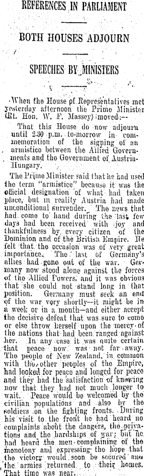 REFERENCES IN PARLIAMENT BOTH HOUSES ADJOURN •.-■/■' ' ' ' " :' ' , . SPEECHES BY-MINISTERS •When the House pf.Representatives met yesterday afternoon the Prinio Minister (£t. Hon. W. F, Massey) InioveA:— That this House do now adjourU ■ until 2.30 p.m.. to-morrow in commemoration of the signing of an , armistice between the Allied Govern- . .-mentis and tho Government of -Austria-' : Hungary. y ■■'.-. ■■■.'■ The Prime Minister said that he had used the term "armistice" because it , was the official -designation 'of what had taken place,- but m reality Austria had made unconditional surrendor v ' The news that had- como to' hand during the last few days had been received with ijoy and thankfulness by, every citizen of the Dominion and of the British Empire. He felt that, the occasion was oi .very great .importance* The.'last of Germany's allies had gone out of the war. Gμ - - iiiany now stood alone ngninst the forces of tho Allied Powers,' and it was obvious that she could not stand long in that position. Germany must sc-ek an nml of the war vgry sliortly— -it might be in ii week or in a'nioutli— and either accept tho decisive defeat that was.sure to come or else throw herself'upon the mercy'of the nations that-had been, ranged against her. . In; any ;easo: it was quite certain. /that peace. . now.' was- iiot far away. Tho people of New Zealand, in common ■with thb/other peoples of tho Empire, had looked for peaco anil longed for peace and they had the 'satisfaction -of Iniwingnow that they had not much longer to wait.. Peace would bo welcomed by tho civilian populations and al9o by the soldiers on the fighting fronts. During his visit to the front ho had heard no complaints nbofit the dangers, thoiprivationa and tho hardships of lyar: But Tie. had heard the niciir complaining of the monotony and expressing- tho hope that. the victorj ; would.soon be sneu'red' riiu■ ,'thc'.' armies |returned., to : their homes. That time was near..!, ", '. ' .