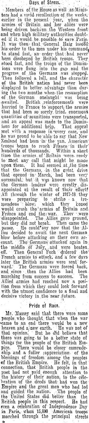 ' ::, Days, of Stress.,:' . / • Members of: the House (is well ;aS:M.iuis•iers had a'vivid-recollection.of.the weeks,- i earlier in the presento year, when Iho j arini.es: of Britain, and her allies ■ were being driven. bttckton. tlio Western front and when-high military authorities.doubted if it;would:be.possible to save Paris. It was then.'that.-General Haig isoifSct"his:orderto the men undor his to stand fast, an- order- that .had never been disobeyed by. British troops. They , stood fast, and the troops of the Dominions were flung into the gap aud the progress of..the' Germans : was stopped. Then followed a lull, and the charucwr of the British nation had never been displayed to better, advantage than during the two mOnthe when-lhe resumption of .the. German onslaught-' was 'being. --awaited. British .reinforcement's were hurried to France to support) the armies that had been so- sorely, tried, 'enormous quantities of munitions were transported, ■ and an appeal was made to the Dominions for additional help. That appeal met with a response in-every case,"and he was proud to that New Zealand had'been in'the yan. American' troons began to reach France 'in their' hundreds of thousands. Within a short time tho■ armies, of 'Britain -were- ready' to meet any call that .might be niaou upon -them.' It had seemed at .(ho time thai the Germans, -in-.the great drive that -opened-in- March; had been very successful;, but .it was known now that the German leaders' were . cre'atly. disappointed at the result of their .'effort? All through, the winter of ■ 1917-18. they were preparing: to -strike ■ a tre.inendous '■ blow; which they Loued ■would crush the'armies of Britain nnd. France and end '.the; war... Thev -were ■disappointed. Tho : Allies gave ground, but they,did not break. Then came the ' pause. He could'say now that the Allies decided to await the next German blow before attacking: on their own accounfe '.Tho'-Germans'Attacked' again in-, the ' middle jif .'July,-.and were beaten, off. Then General toch drdered' the' French armies to' attack.' ana a few davs later the British armies were sent , forward." The Germans were forced back, and .since -■ then the-'Allies had been inarching from success to success. The Allied armies had reached now a position from which they could look forward with the utmost confidence to a final and decisive victory in,tho'near .future. Pride of Race. Mr; Massey said that there were some people; who thought, that when the war >came to an end there would be u new heaven and aonew earth. He was not of that opinion. ' But ho "did. believe that there was going. to' be a better state of things for the people of the British Empire. There, would be, closer" comradeship and a fuller (appreciation, of the blessings of freedom: among* the peoples of the British Empire. He felt, in that connection, that British people in the ' paet had not paid enough attention to the history qf their nation, to tlie 'lira'tion.'of the deeds that: had won the Empire and the great men who had led and guided'the. nation. -Iho people of the'"United. States did better than the British, people in this respect. He had ecen a celebration of Independence Day in Paris, when 15,000 American troops marched through the principal streets e ■ '• ■' ■•.*'• •■.- : . !