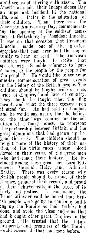 amid scenes of stirring enthusiasm. Tho Americans' made their Independence Day an important incident in the national life, and a factor in the education of their children. ' Then there was the American Anniversary Day, commemorating tho opening of tho soldiers' cemetery at Gettysburg by President Lincoln. It was on that occasion that President Lincoln . made ono of the greatest speeches-that men ever had tho opportunity to hear or read.. The American children were taught to recito that epeech, with its'noble reference to "government of the people by the peoplo for tho people." He would liko to see some similar commemoration of great events in the history of the British people. The children should bp taught pride of race, pride of .Empire,' and love of country. They should be taught what the flag meant, and what , the three' crosses upon it stood for. He had said in London, and he would say. ngnin, that lie believed tho time was coming for the addition of a fourth cross; to represent' the'partnership between Britain mid.the great dominions that had grown up beyond the' seas. The children should be taught more of the history of their nation, of .the virile races whose blood flowed in their veins, of the great men who had-mnde their history. He included among those great men Lord Kitchener, Marshal Haig, .and Admiral Doatty. ' There was, every reason why. British people should be proud of their Empire; prnudof their record, end proud of their achievements in She cause of liberty and justice. In conclusion, the ■.Prime Minister said ho hoped that British peoplo were going to continue building up the Empire a.5 their fathers had done, and avoid tho vices and sins that had brought other great Empires to the ground. He trusted that the future prosperity and greatness of the Empire would exoeed all that had gone before. ■