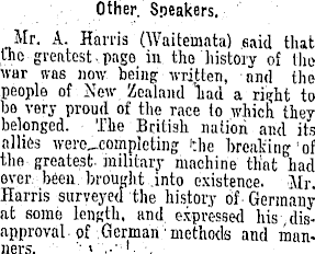 Other. Sneakers. Mr. A. Harris (Waitemata) said that ihc greatest.page in the history of tho war was now being ■ written, and the people of New Zealand Tiad a rii?ht to be very proud of the race to which they ■belonged. The British nation and its allies were-completing the breaking 'of the greatest, military machine that had ever been brought .into existence. MiHarris surveyed the history df • Germany at some length, and expressed his,dis-approval-of German , methods and manners. '■ > ",■■ '■'■ ;.