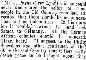 1 Mr. J. Payne (C4rey Lynn) said he could never, understand-the policy of some people in the Old Country Who hat! advocated Hint there should be.no annexations and no indemnities. : In his opinion it VroulcUbe wrong to hand back Samoa to. Germany., All ,the German African colonies should be annexed. (Hear, hear,) "I suggest to thb Philip Snowdens and other gentlemen of that ilk in the Old Country thnt if they really 'desire peace- to' , be brought aboiit they