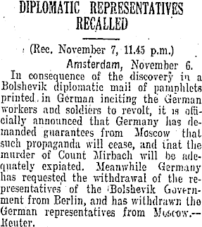 DIPLOMATIC REPRESENTATIVES RECALLED i (Rec. November 7, 11.45 p.m.) Amsterdam, November 6. In consequence of the discover?' in. a Bolshevik diplomatic mail of pamphlets printed,in German inciting the German .workers and soldiers to revolt, it is officially announced that Germany has demanded guarantees from Moscow that such propaganda will cease, and ihat the murder of Count Mirbach will be adequately expiated. Meanwhile Germany has requested the withdrawal of the representatives' of the 'Bolshevik Government from Berlin, and has withdrawn the German representatives from llofieow.— Keuter.
