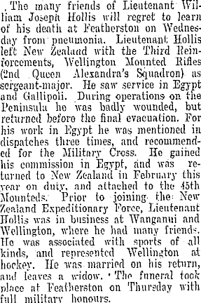 , Tho many friends of Lieutenant William Joseph Mollis will regret to leani of his death at Featherston on Wednesday from pneumonia. Lieutenant Hollis left New Zealand with the Third Reinforcements, Wellington Moiinted Rifles (2nd Queen Alexandra's Squadron) as sergeant-major. He saw service in Egypt and Gallipoli. During operations on the Peninsula ho was badly wounded, but returned before Hie final evacuation, For his work in Egypt he was mentioned in dispatches three times, and recommended for the Military' Cross. He gained his commission in Egypt, and was returned to New Zealand in February this year on duty, and attache;! to the -(sth Mounted?. Prior to joining- the New Zealand Expeditionary Force, Lieutenant Kollis was in business at Wanganiii and Wellington, whore he had many friends. Ho was associated with sports of all kinds, and represented Wellington at hockey. He was married on his return, ami leaves a widow. • The funeral took place at Featherston on Thursday with full military honours.